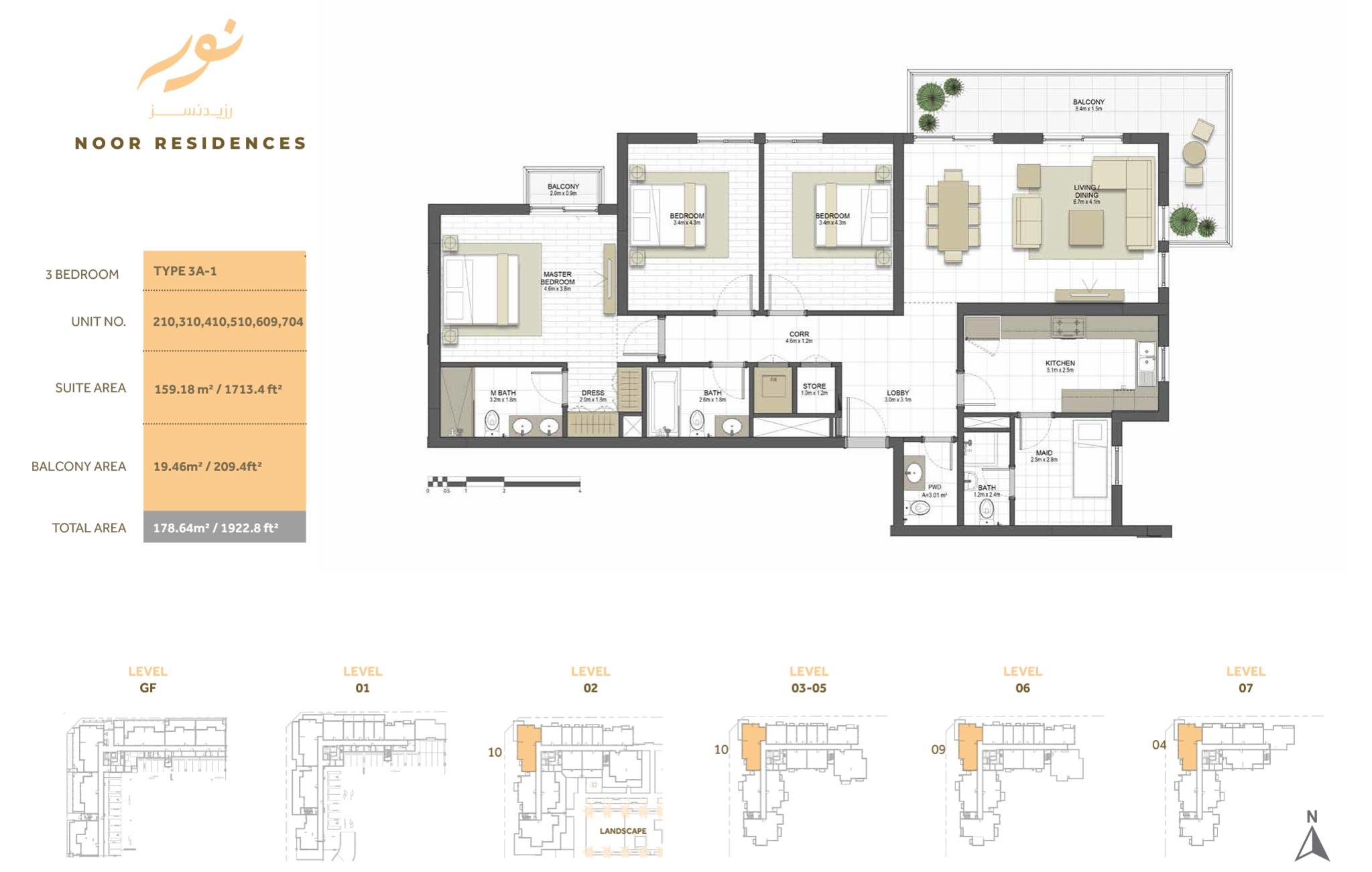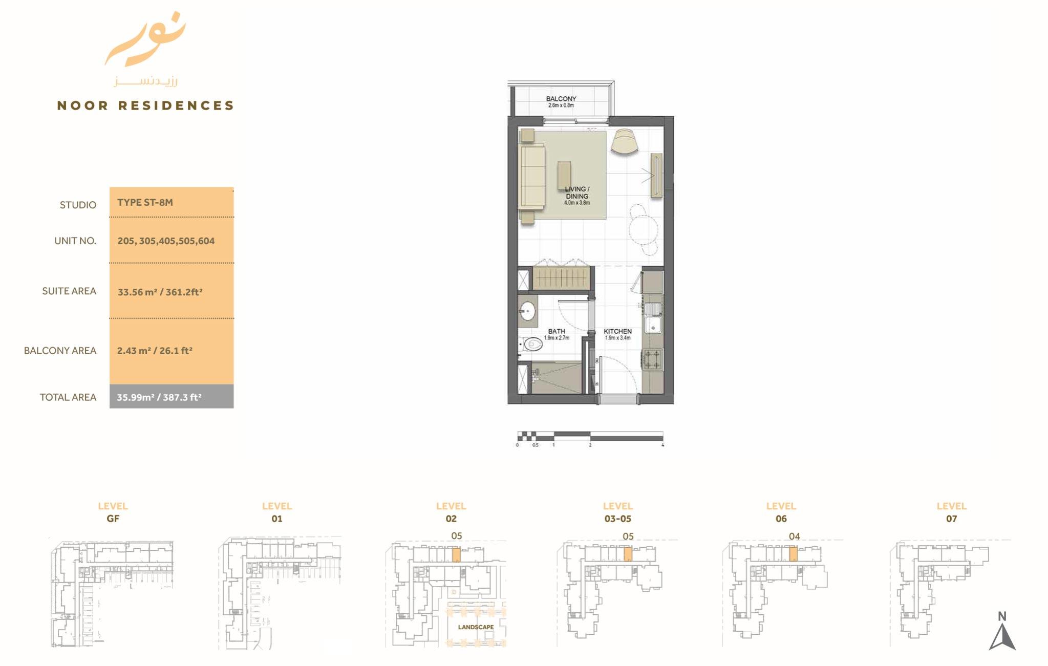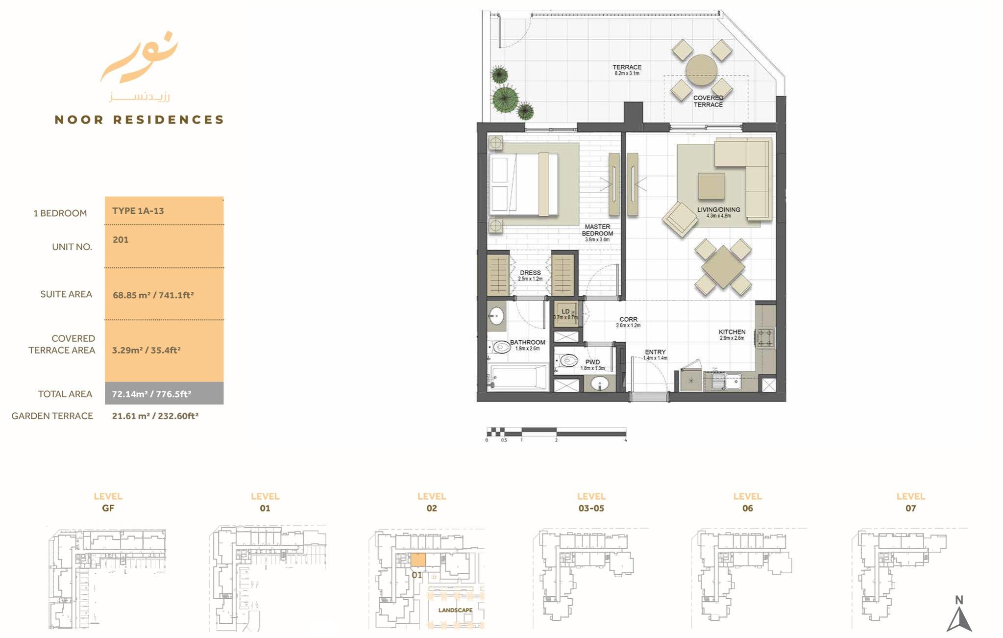 Several apartments located one side of the building that boasts views of the Dubai Canal, while back-side units offer views of the boulevard. Every apartment of Noor Residences has the highest specifications includes open space that crafted with convenience and comfort in mind. In addition to private gardens at the podium level, community residents can enjoy serene views of the canal and the Sharjah horizon. Surface units of the building provide direct road access from their terraces.